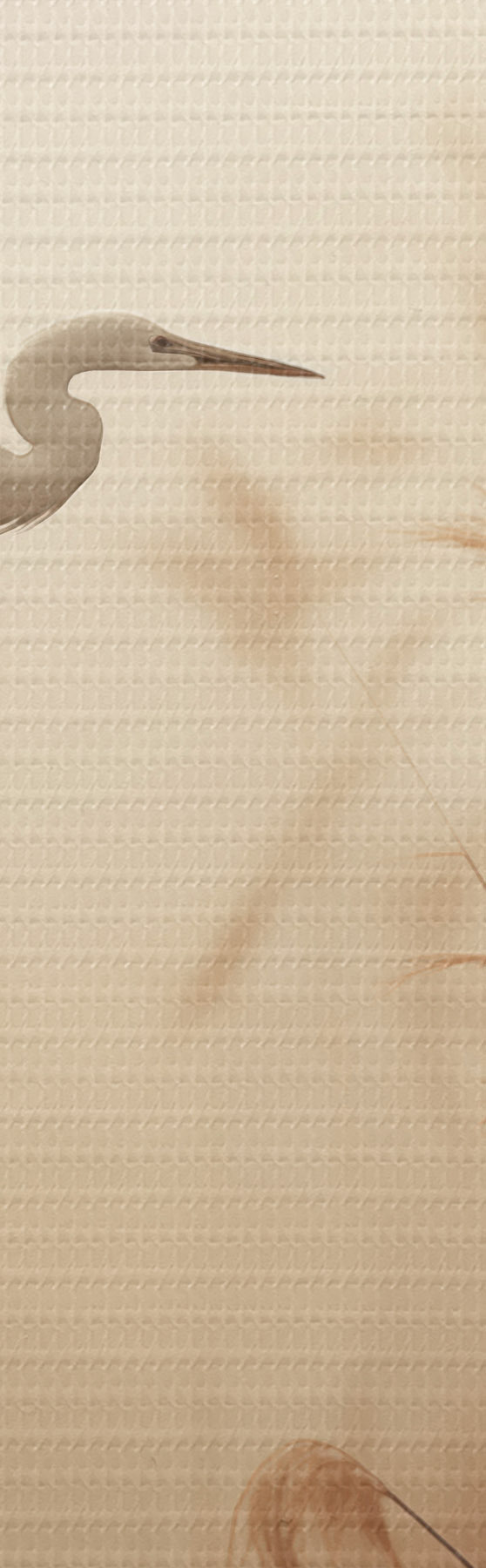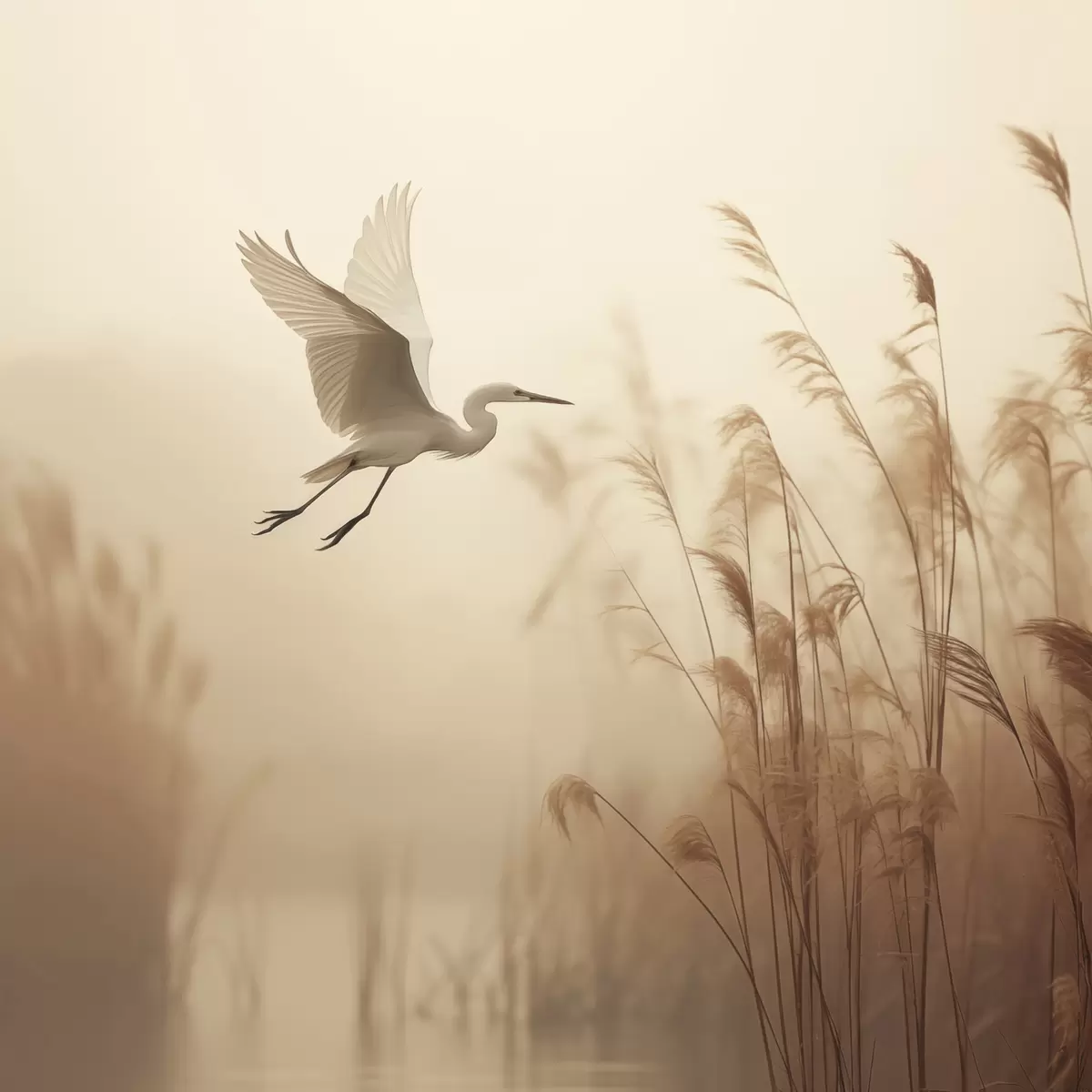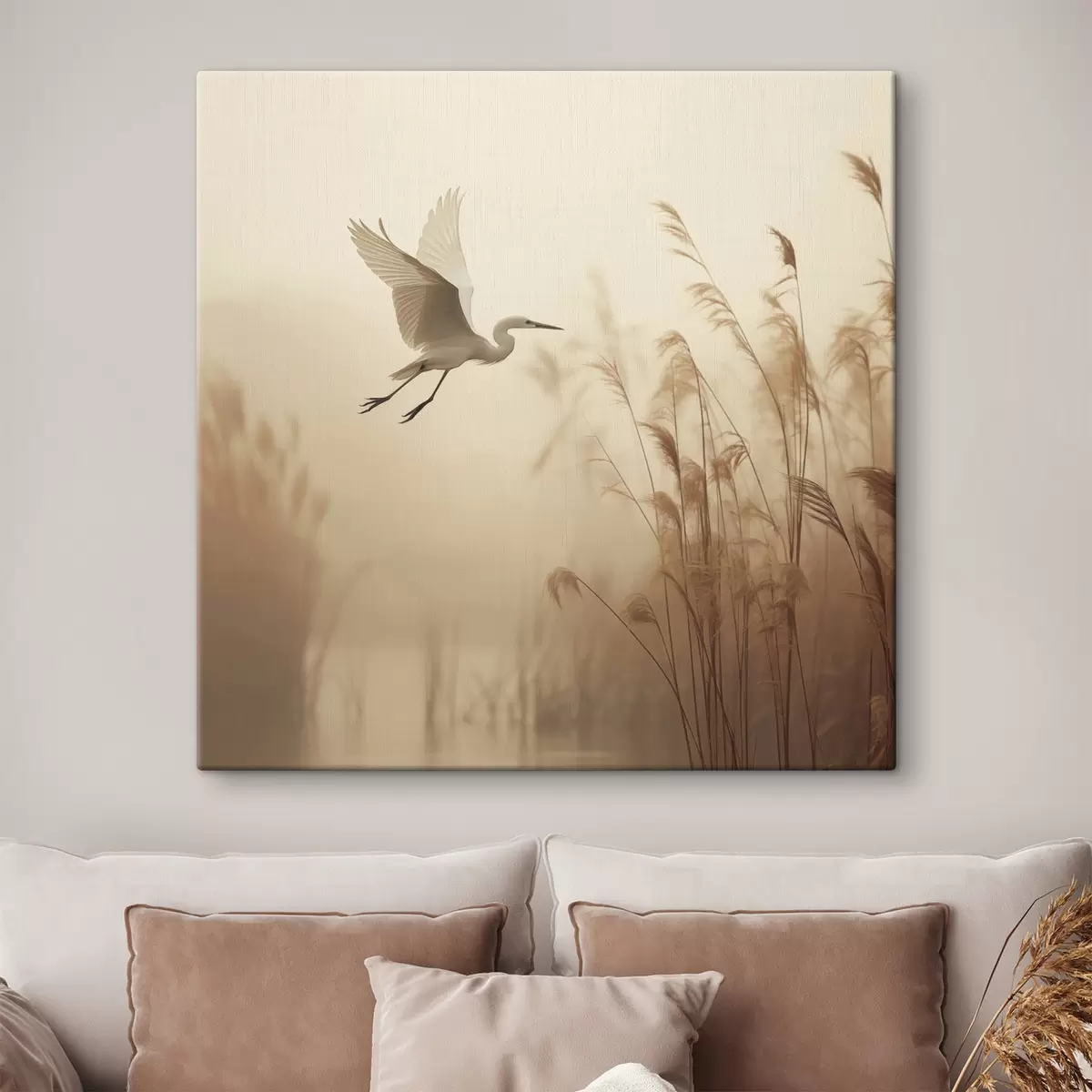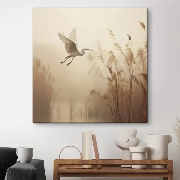 Maalid Valge kurg lendab järve kohal, mida ümbritsevad kõrged pilliroog ja puud taustal Nr s48390