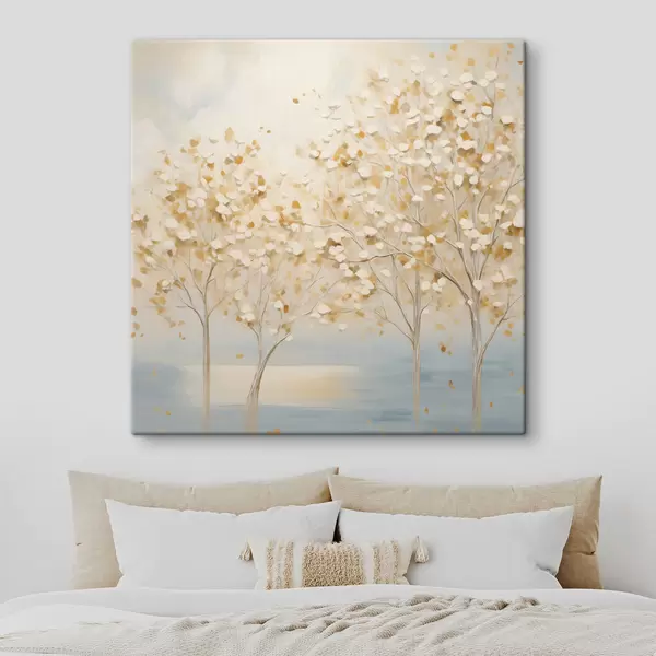Maalid Tekstuurne maalistiil, millel on kujutatud valge- ja kollalehelisi puid helesinisel taustal Nr s48392