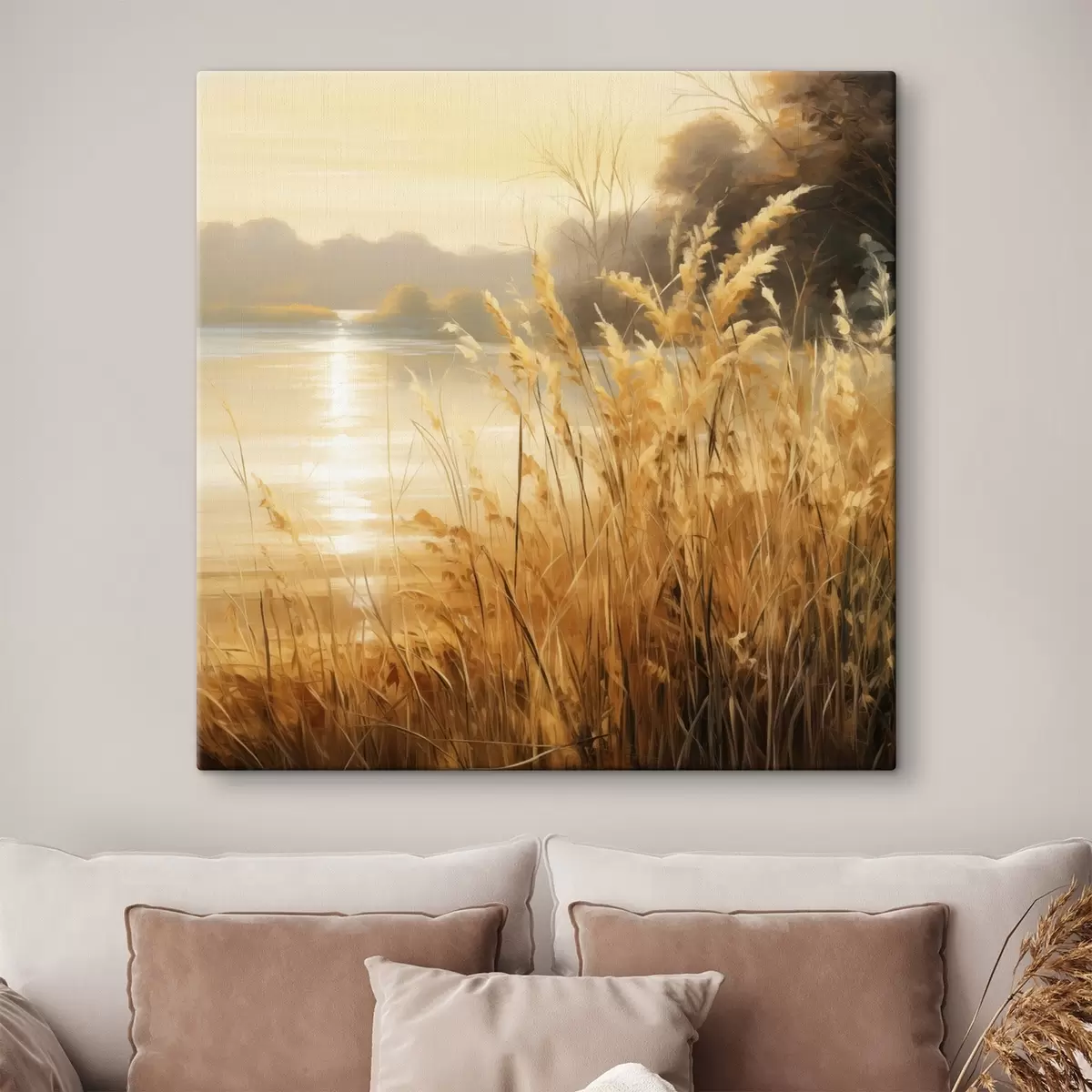 Maalid Esiplaanil kõrge, kuiv viljakobaradega rohi, tagaplaanil järv ja puud Nr s48393