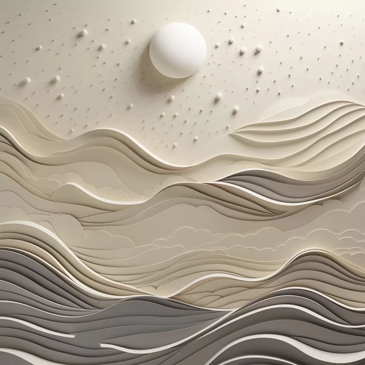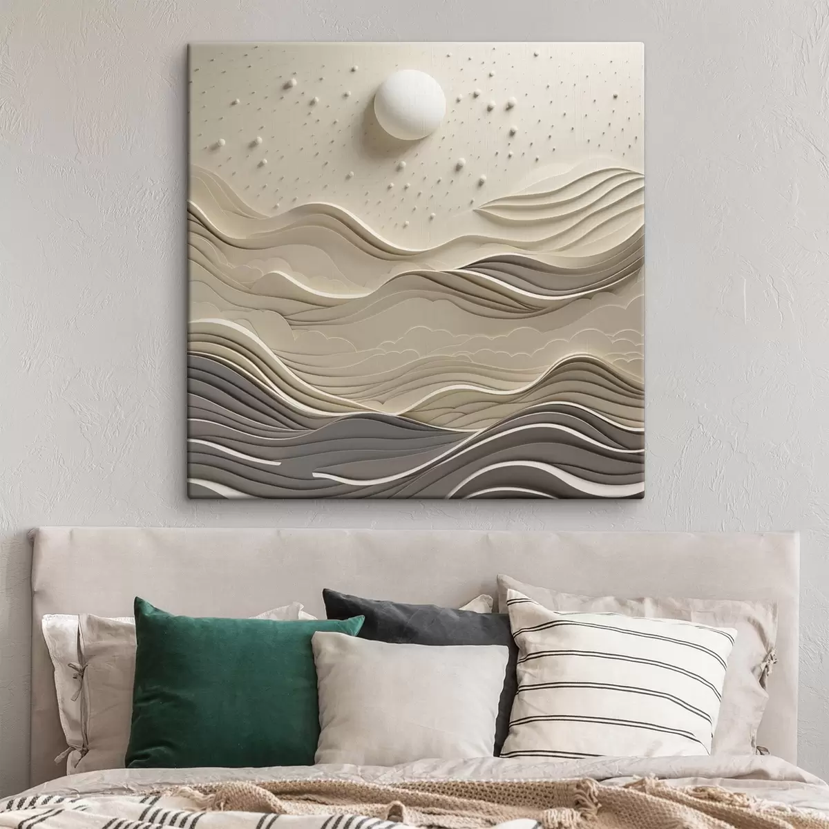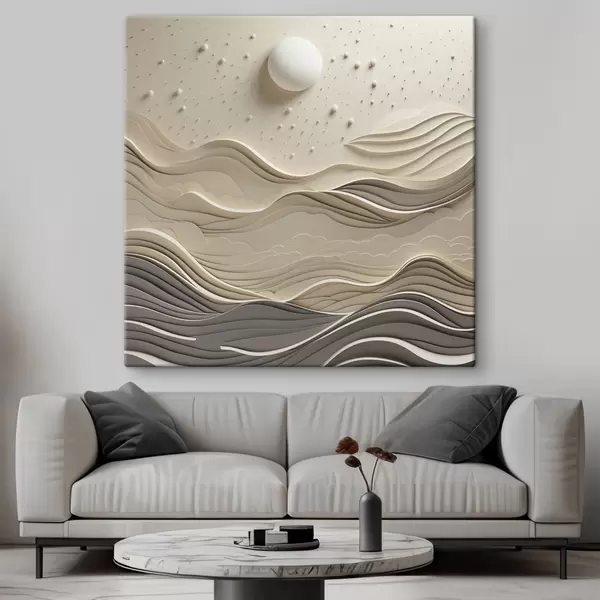 Maalid Minimalistlik stiliseeritud maastik künklike mägedega ja suure kuuga tähtede taevas, abstraktne kunst Nr s48402