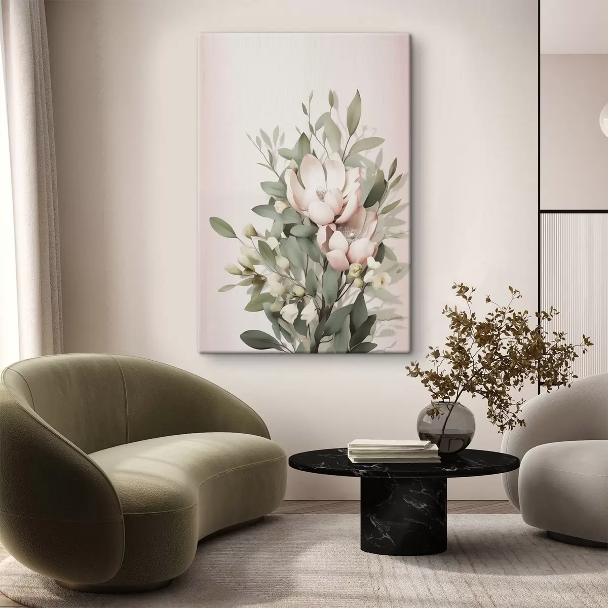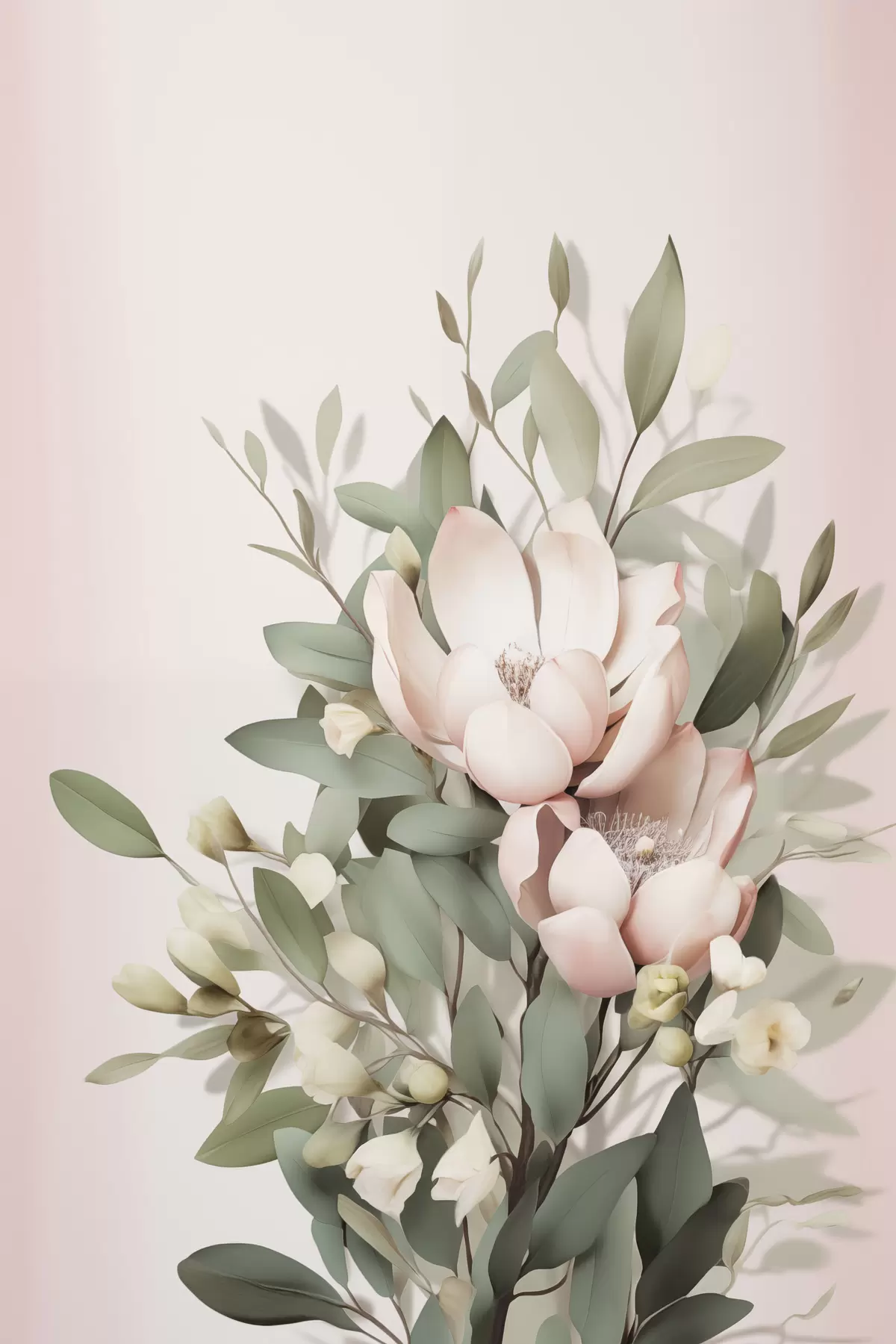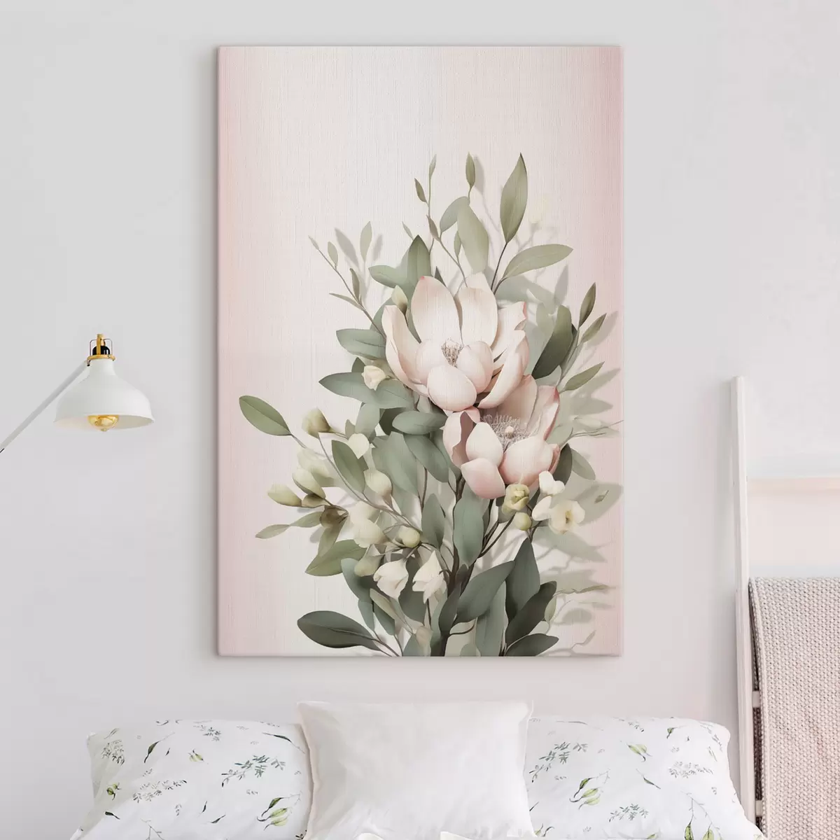 Maalid Pastelltoonides lillede kimp eukalüptilehtedega, heleroosa taustaga Nr s48728