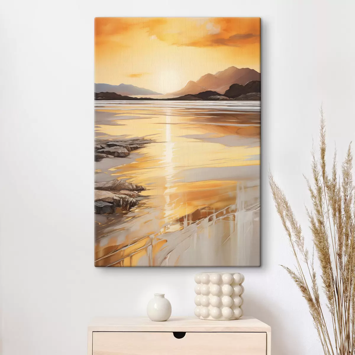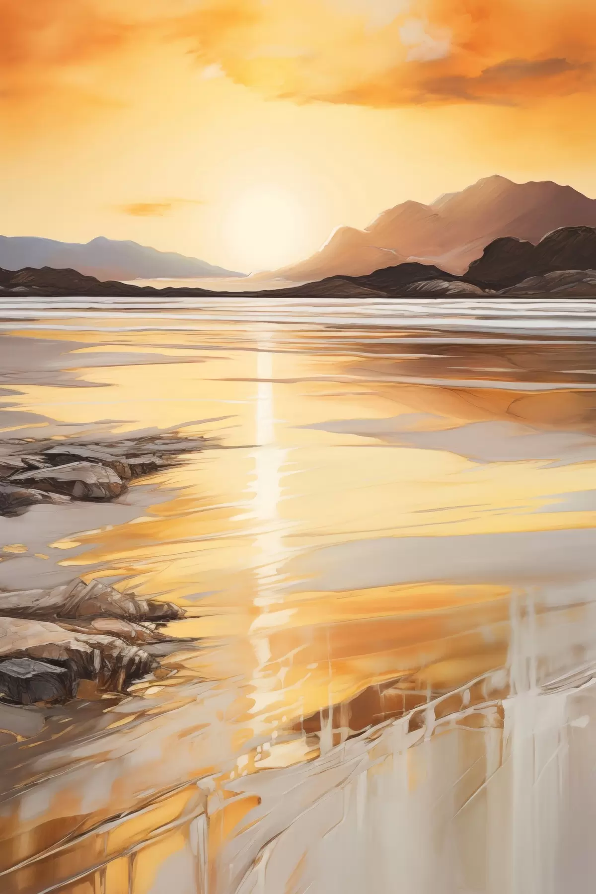 Maalid Maastik jõega ja mägedega sooja oranži taeva all, päikeseloojang Nr s48756