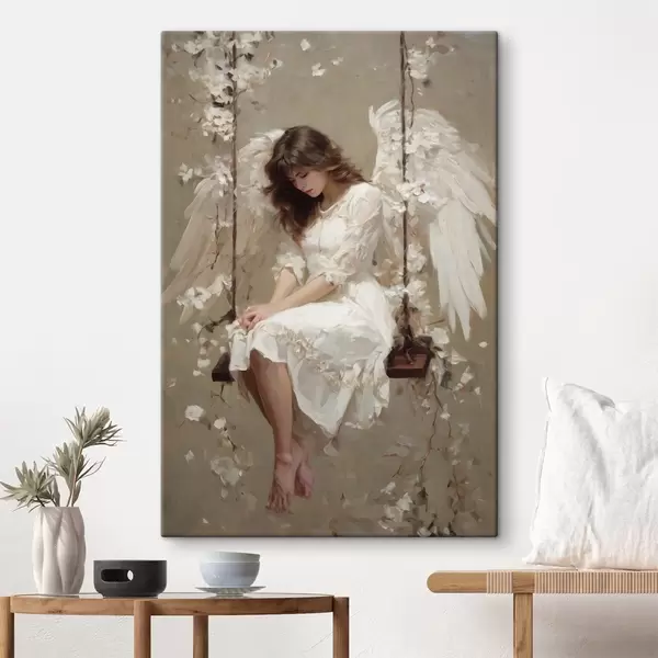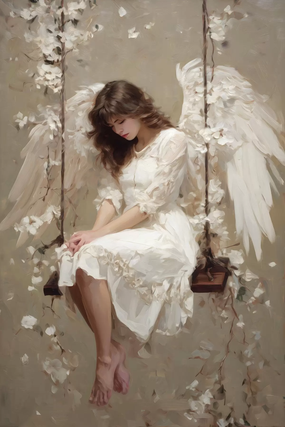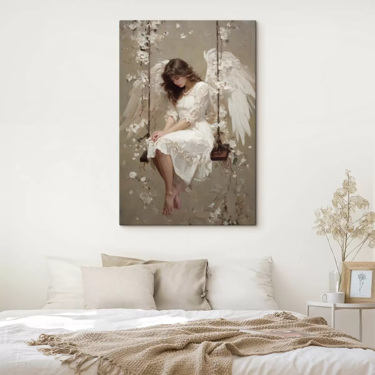 Maalid õlimaalistiilis maalitud kiigel istuv inglikene Nr s48789