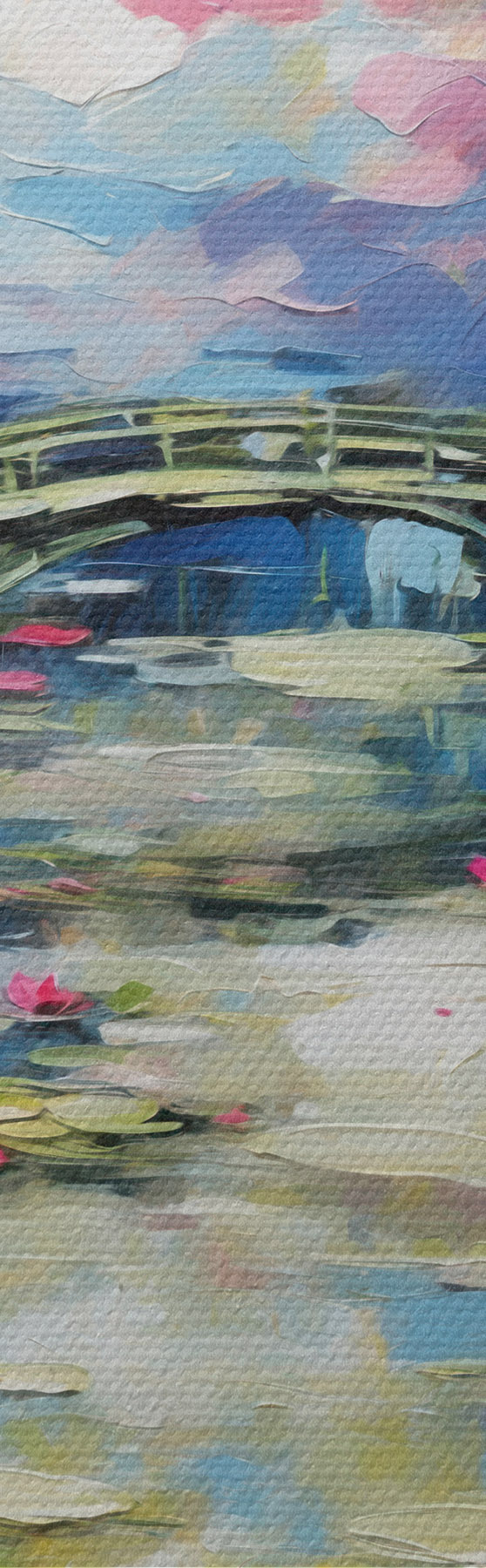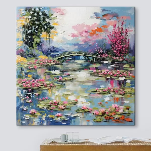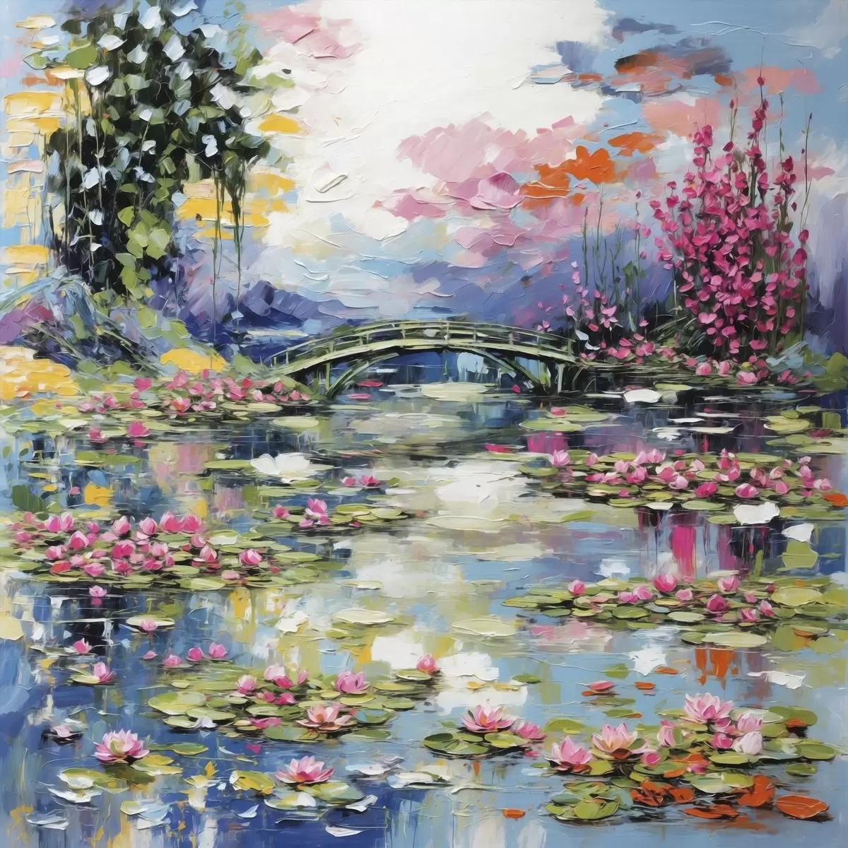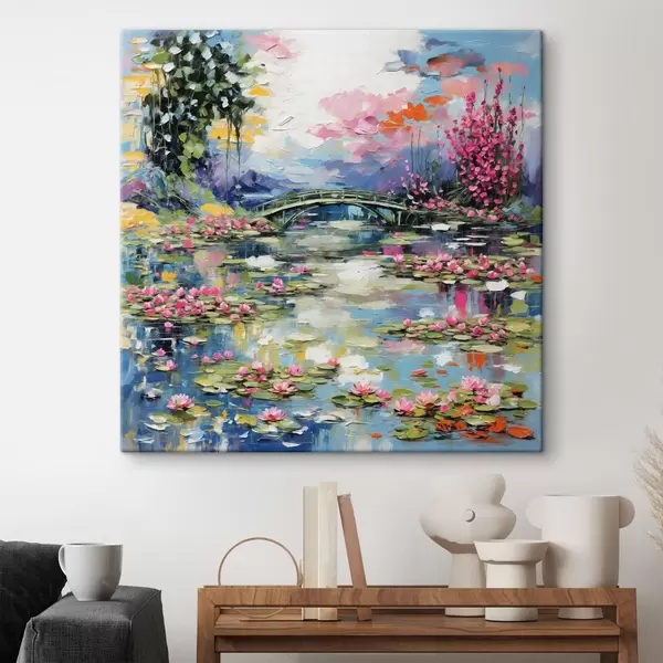 Maalid Impressionistlik maal: sild üle tiigi, kus kasvavad liiliad ja lilled Nr s48807