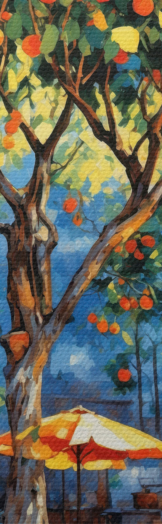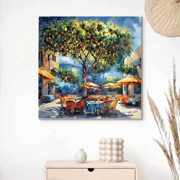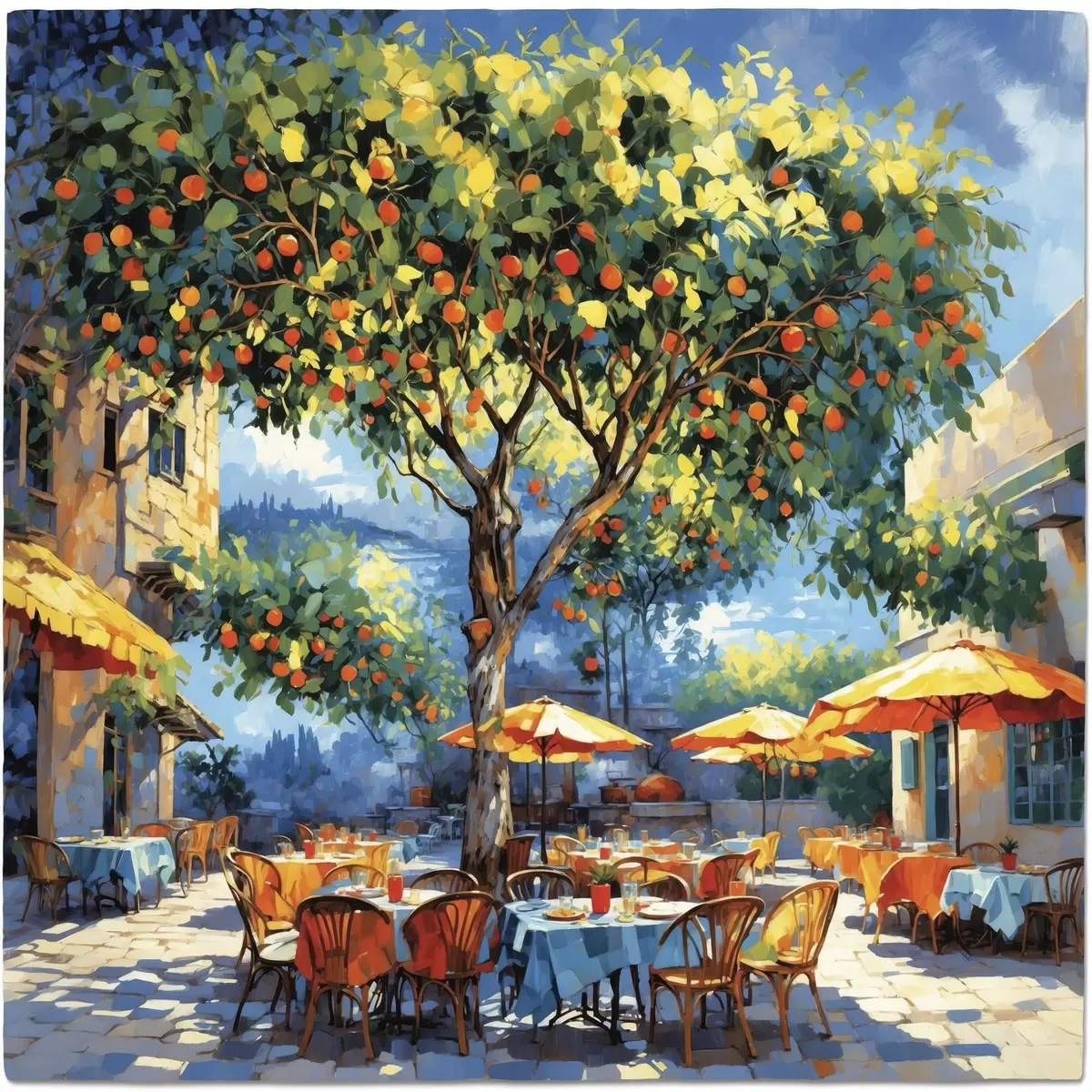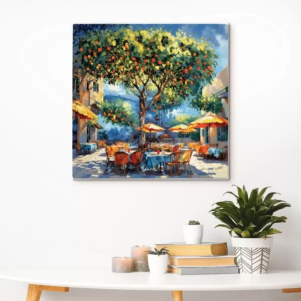 Maalid Impressionistlik kohviku sisehoov puu ja päikesevarjudega Nr s48811