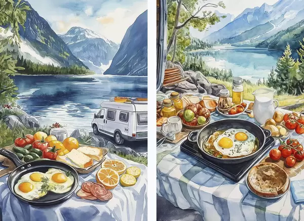 Poster Hommikusöök looduses, reisimine, õues elamine, akvarellistiil, Norra Nr d00404