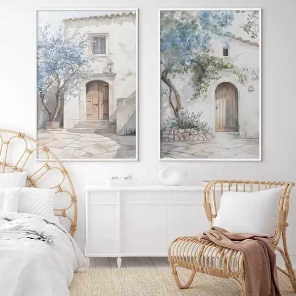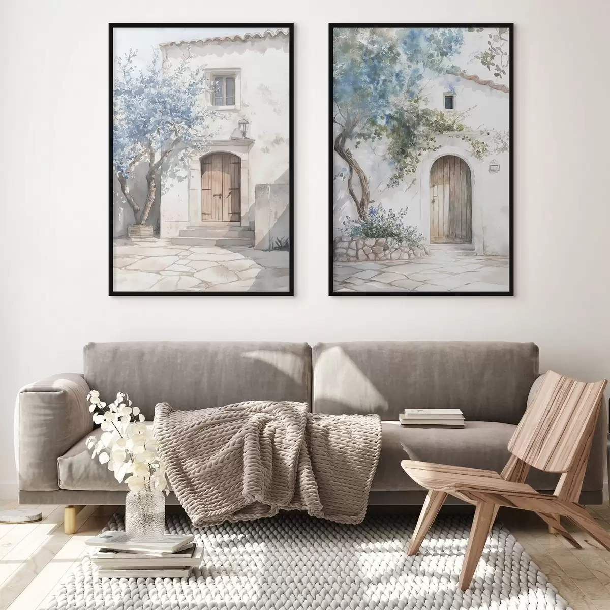 Poster Kreeka valged majad koos õitsevate puudega, Vahemere, akvarellistiilis joonistus Nr d00419