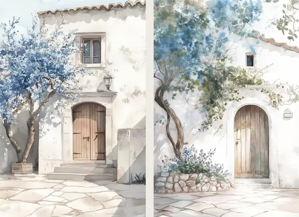 Poster Kreeka valged majad koos õitsevate puudega, Vahemere, akvarellistiilis joonistus Nr d00419