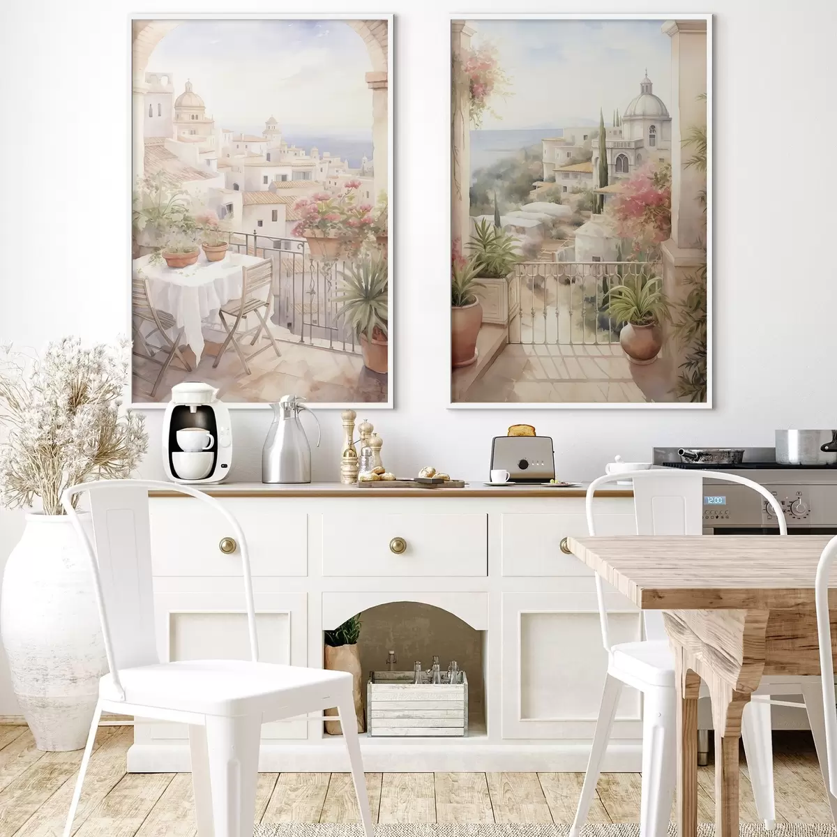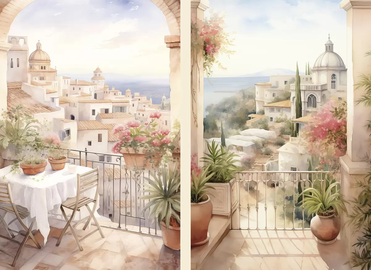Plakat Päikeseloojang rõdul, arhitektuur, õitsevad lilled, akvarellstiil, Vahemere-äärne stiil d00420