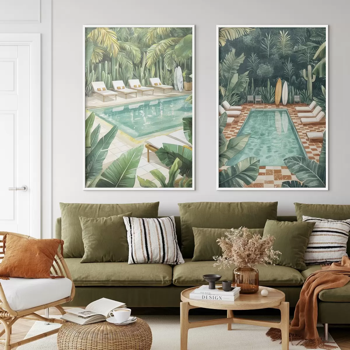 Poster Suvine bassein, vintage, troopiline mets, rohelus, palmipuud, akvarellstiil Nr d00422