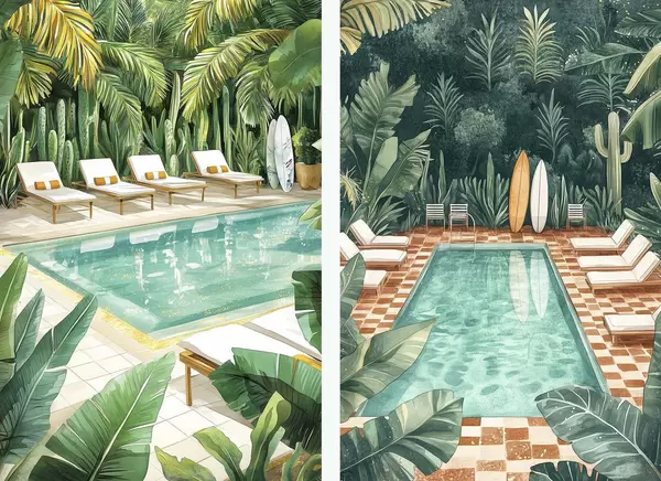 Poster Suvine bassein, vintage, troopiline mets, rohelus, palmipuud, akvarellstiil Nr d00422