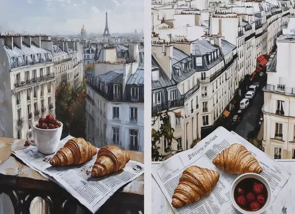 Poster Linnavaade Pariisi rõdult, Eiffeli torn, maasikad, kohv, päevik Nr d00445