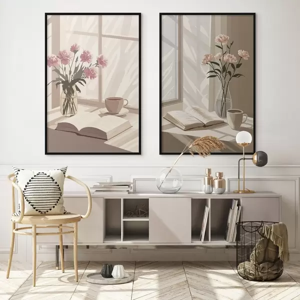 Poster Abstraktsioon, hommikune esteetika, tass kohvi, raamat, lilled Nr d00448
