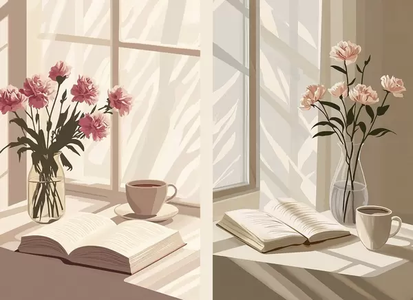 Poster Abstraktsioon, hommikune esteetika, tass kohvi, raamat, lilled Nr d00448