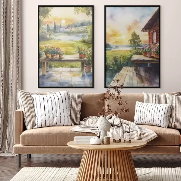 Plakat Suveküla, päikeseloojang, maaliline, lilled, järv, akvarellstiil d00449