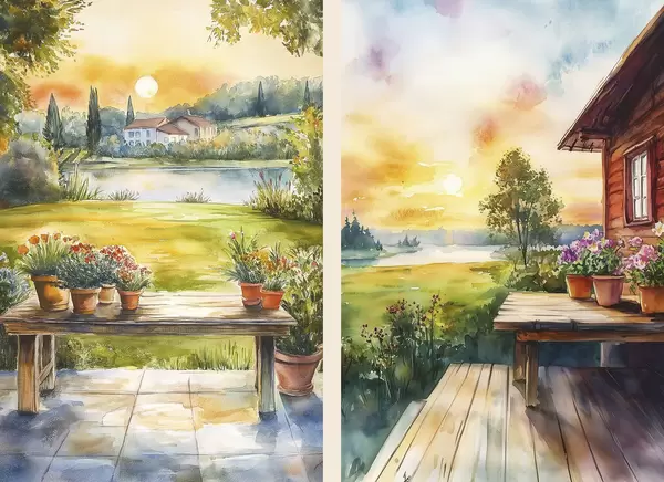 Poster Suveküla, päikeseloojang, maaliline, lilled, järv, akvarellstiil Nr d00449