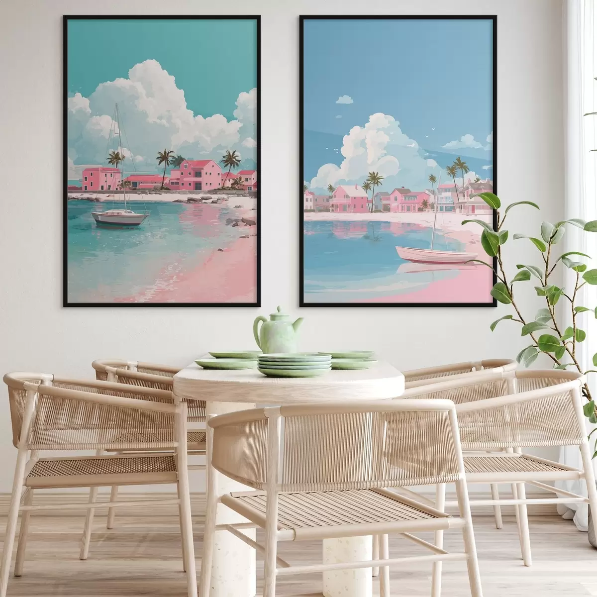 Poster Roosa suvine rand koos päikesepaiste, purjeka ja majadega Nr d00479