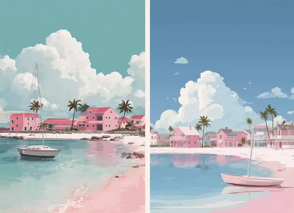 Poster Roosa suvine rand koos päikesepaiste, purjeka ja majadega Nr d00479