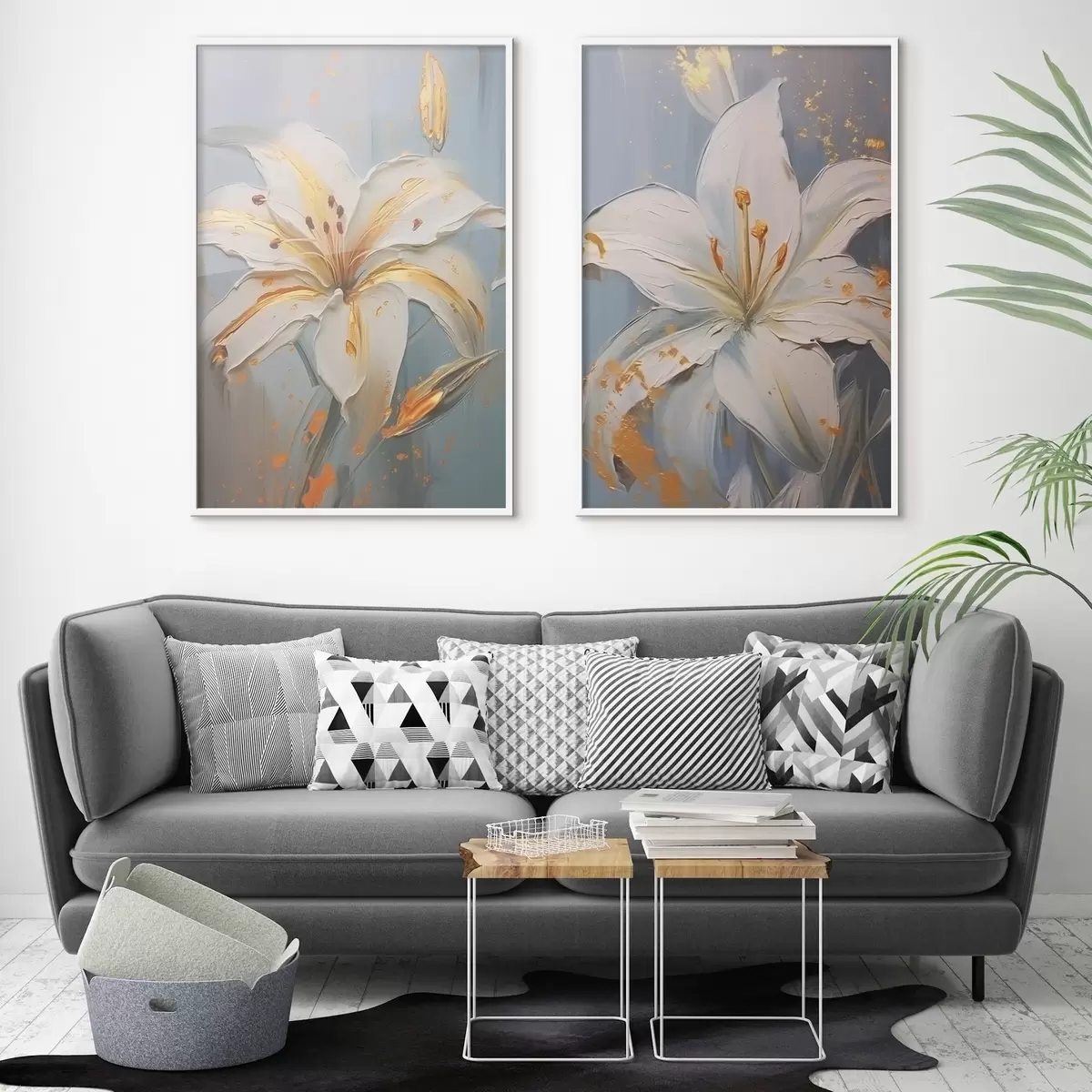 Poster Valged lilled kollaste piirjoontega sinisel taustal Nr d00497