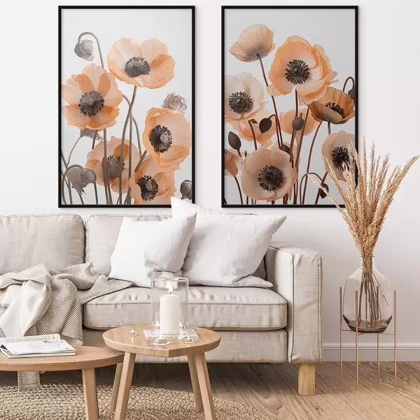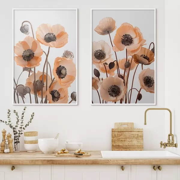 Plakat Oranžid moonid, kuivatatud lilled heledal taustal, pehme valgustus, õrnad kroonlehed, lilleseade d00518