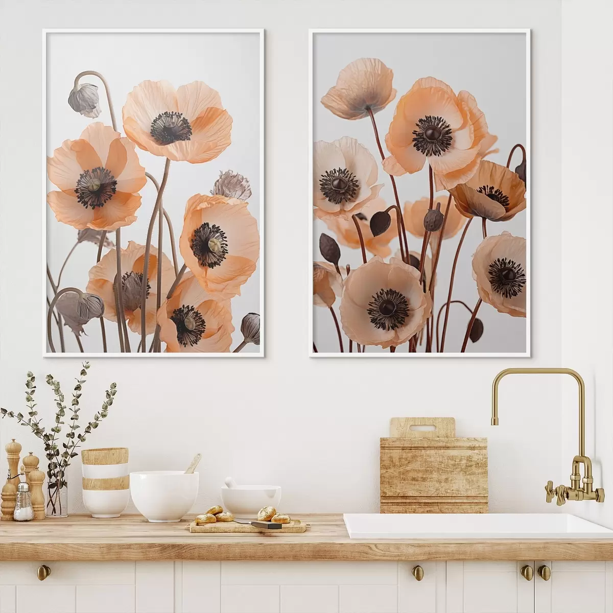 Poster Oranžid moonid, kuivatatud lilled heledal taustal, pehme valgustus, õrnad kroonlehed, lilleseade Nr d00518