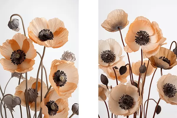 Plakat Oranžid moonid, kuivatatud lilled heledal taustal, pehme valgustus, õrnad kroonlehed, lilleseade d00518