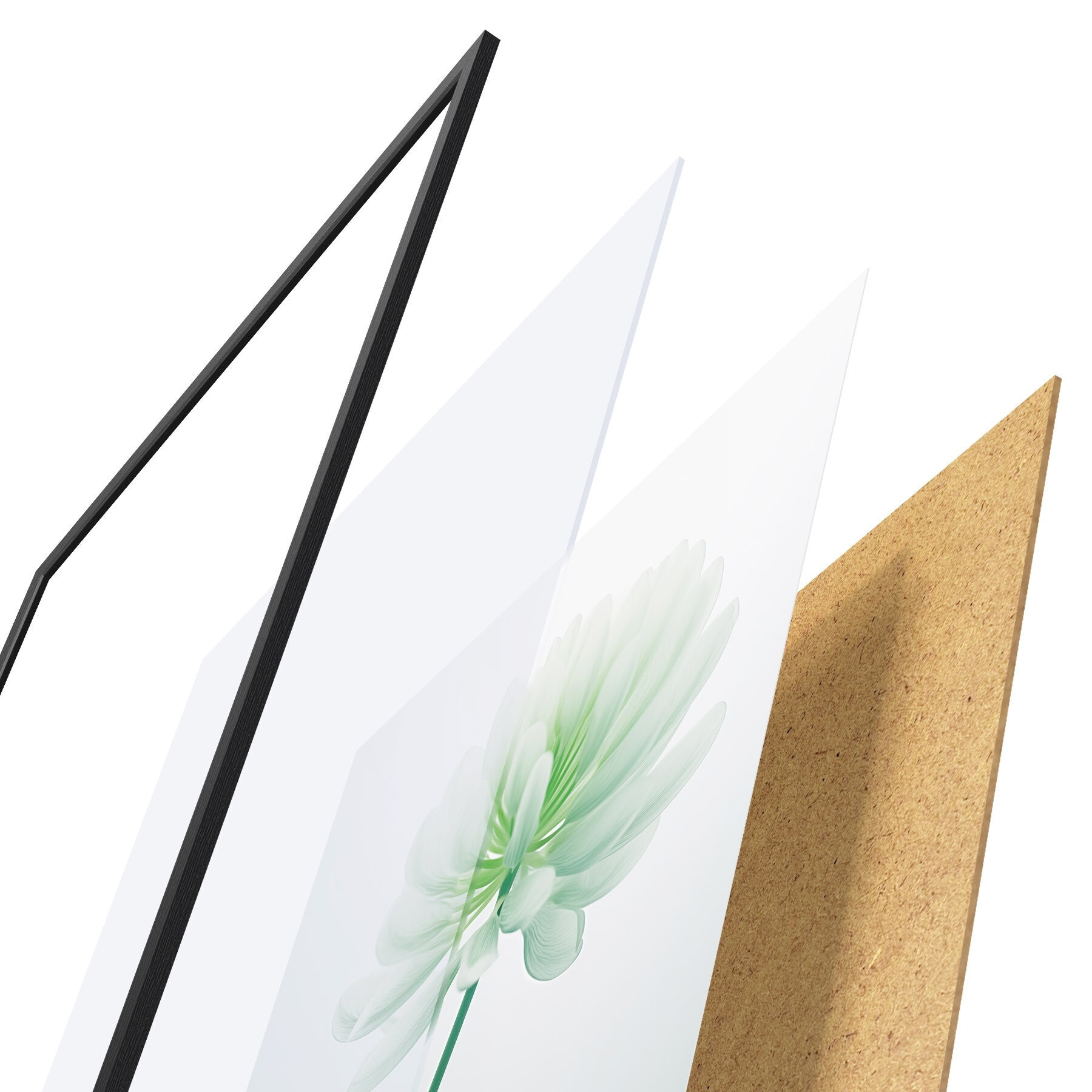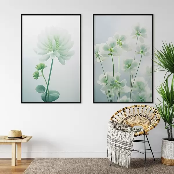 Plakat Valge ristiku lilled rohelise varre ja lehtedega, pehme valgustus, puhas taust, minimalistlik kompositsioon, botaanika d00520