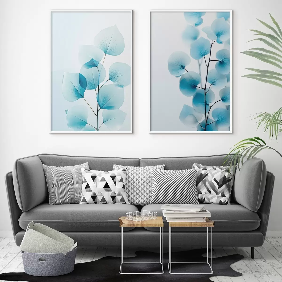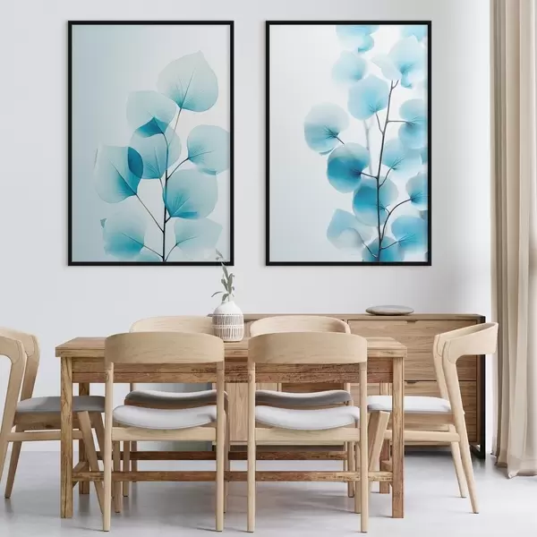 Poster Läbipaistvate siniste lehtedega oks, õrnad veenid nähtavad, kerge ja rahulik kompositsioon, minimalistlik esteetika Nr d00522