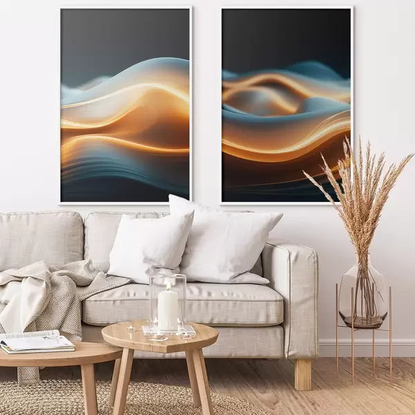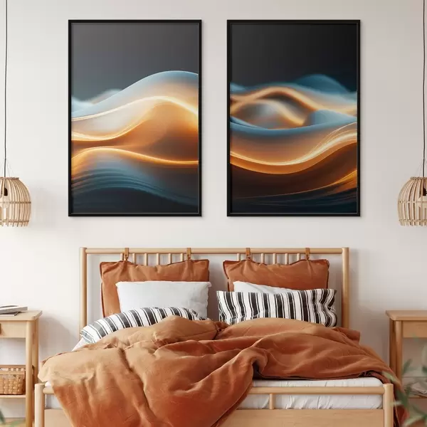 Poster Abstraktsed voolavad kujud oranžide joontega, sujuvad kurvid ja jooned, dünaamiline kompositsioon, tume taust Nr d00526