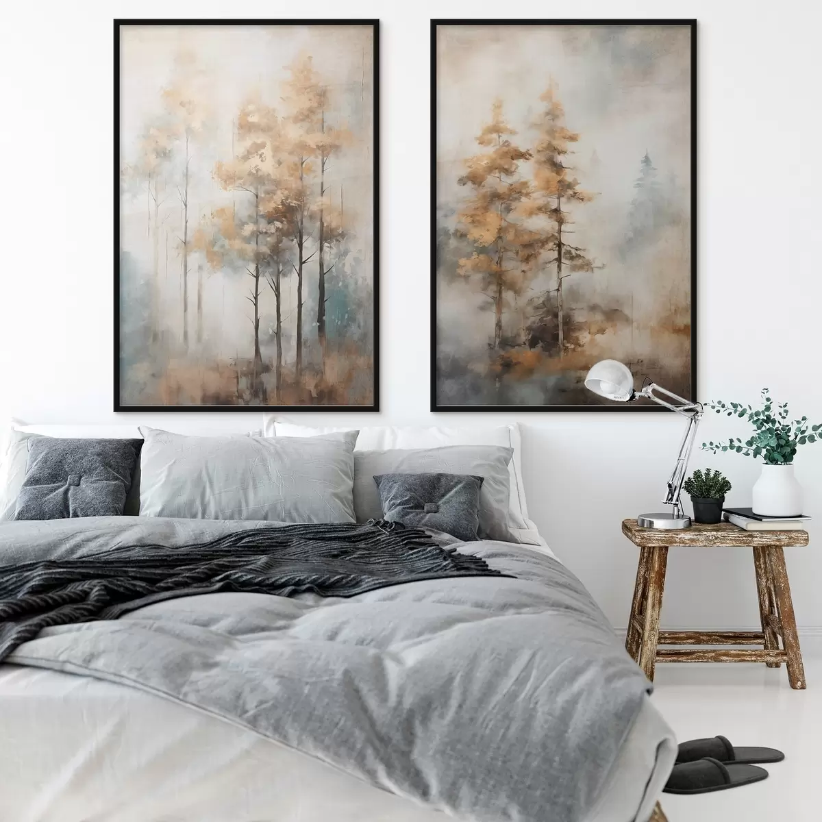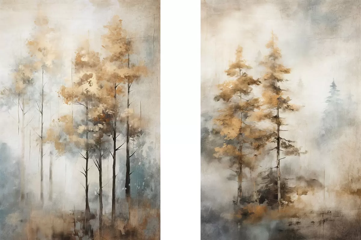 Poster Tekstureeritud kõrged puud kollaste lehtedega metsas , taustal on pehme sinise ja pruuni tooni segu Nr d00528