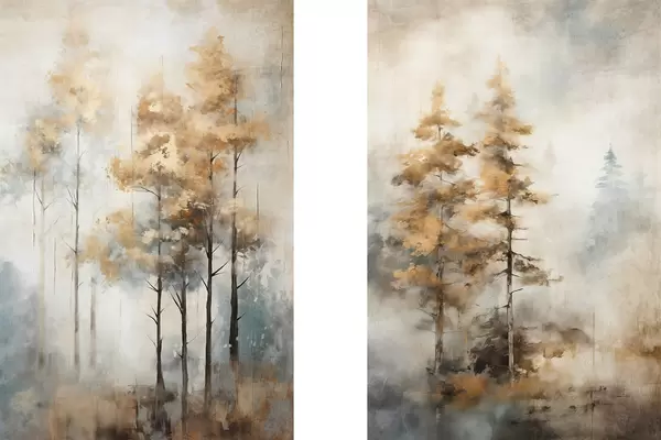 Poster Tekstureeritud kõrged puud kollaste lehtedega metsas , taustal on pehme sinise ja pruuni tooni segu Nr d00528