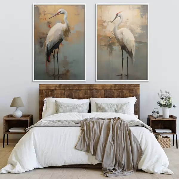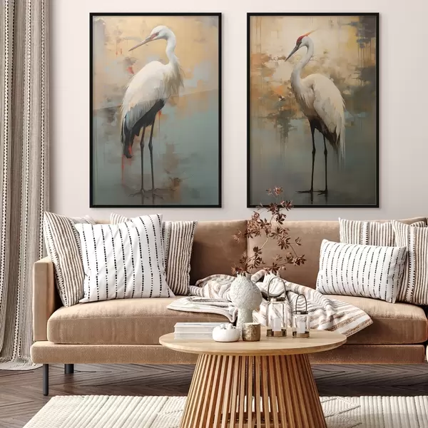 Poster Valge haigur vaiksete kollaste, pruunide ja siniste toonide taustal, mis viitavad udusele, abstraktsele maastikule Nr d00530