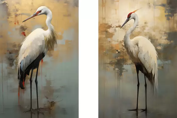 Poster Valge haigur vaiksete kollaste, pruunide ja siniste toonide taustal, mis viitavad udusele, abstraktsele maastikule Nr d00530