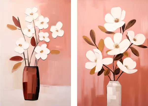 Poster Kompositsioon kontrastsete vaaside ja tekstuursete valgete lilledega Nr d00575