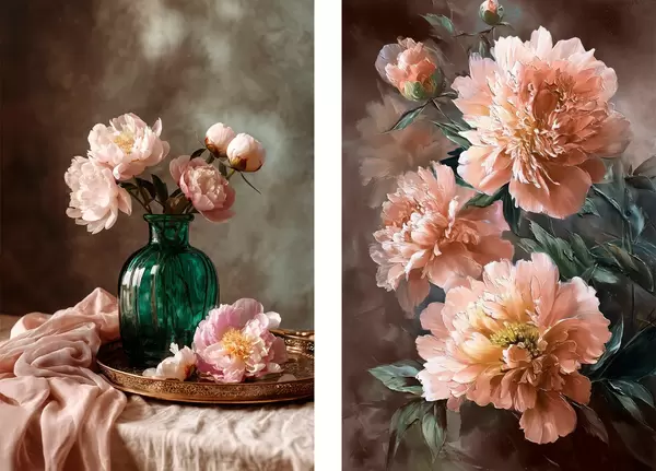 Plakat Paaris kompositsioon roosa puneedega vaasis ja lõuendil d00578