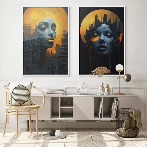 Plakat Tüdruku portree abstraktsel linna taustal d00618