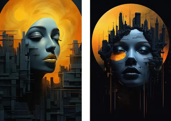 Plakat Tüdruku portree abstraktsel linna taustal d00618