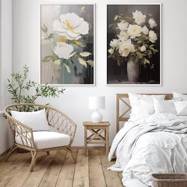Plakat Valged pojengid tumedal taustal: dekoratiivne kompositsioon d00634