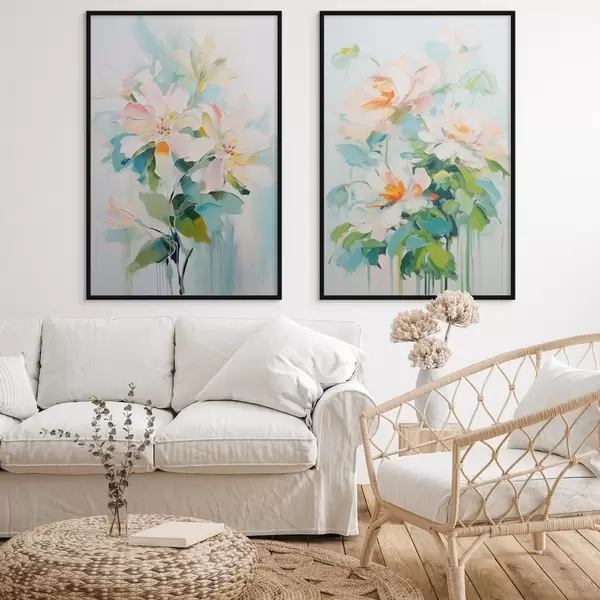 Plakat Valge ja pastell virsiku lilled, rohelised lehed, pehmed pintslitõmbed õlimaali imitatsioon, helesinine taust d00644
