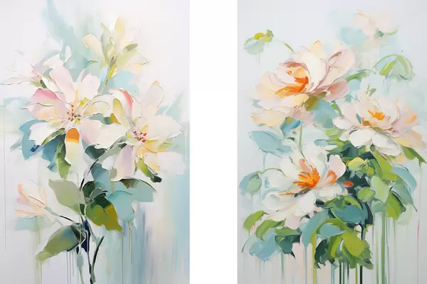 Plakat Valge ja pastell virsiku lilled, rohelised lehed, pehmed pintslitõmbed õlimaali imitatsioon, helesinine taust d00644