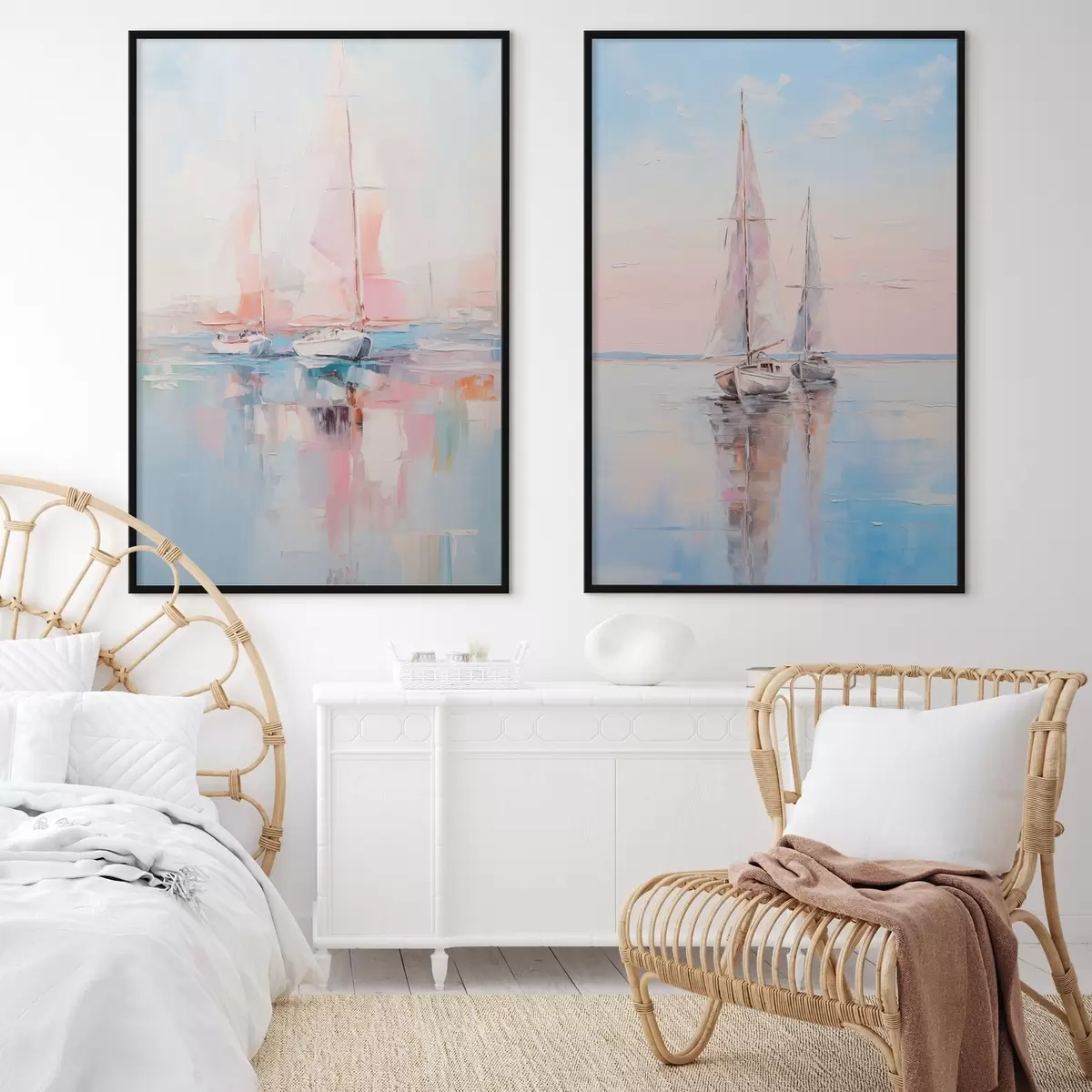 Poster Roosade purjedega purjekad ujuvad rahulikul merel, paatide peegeldused vees, pehmed pastelsed värvid Nr d00648