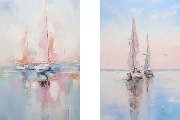 Poster Roosade purjedega purjekad ujuvad rahulikul merel, paatide peegeldused vees, pehmed pastelsed värvid Nr d00648