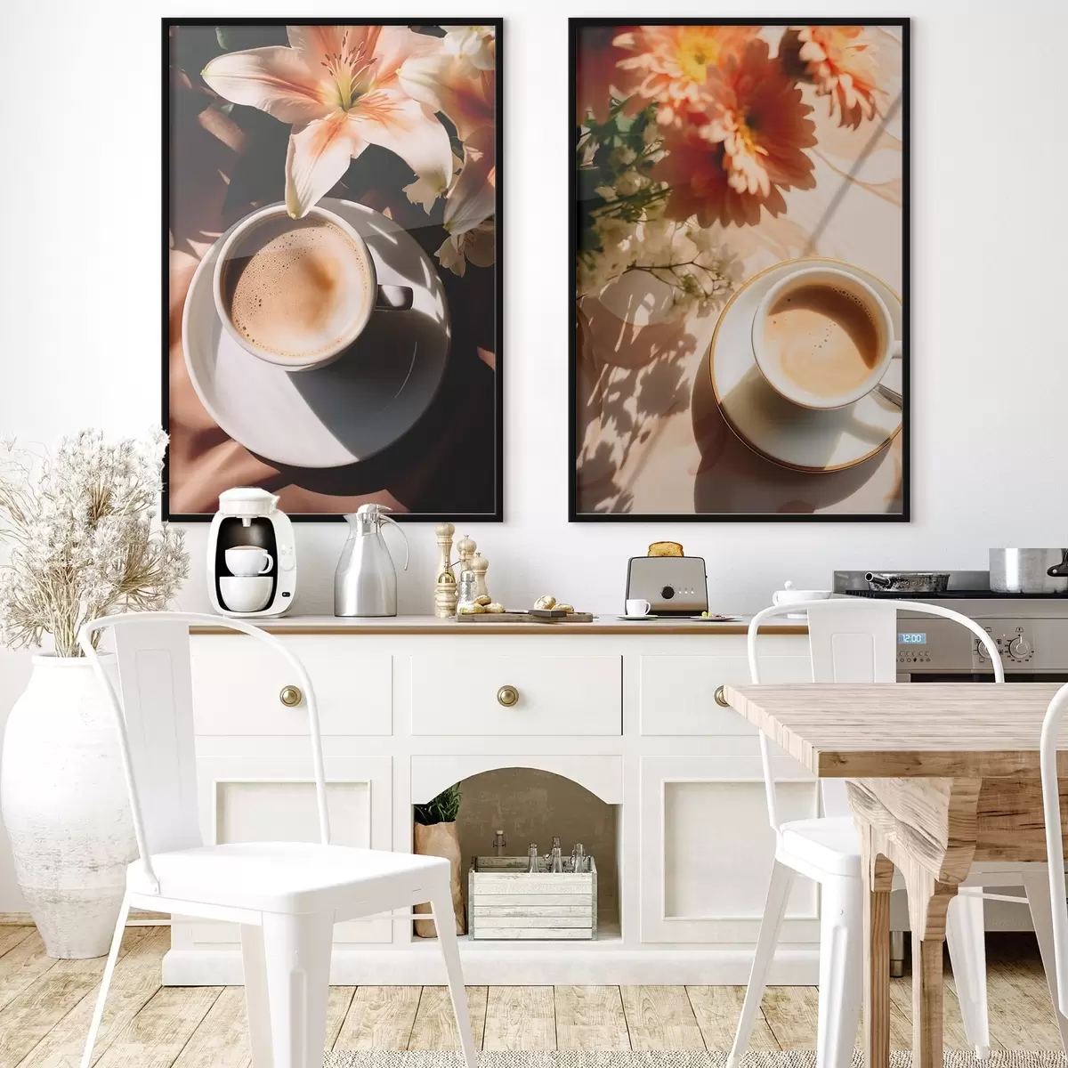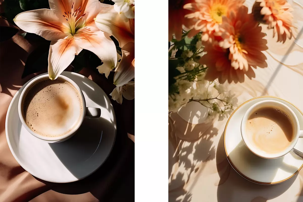 Plakat Tass kohvi koos vahuga valgel taldrikul, taustal mõned lilled, päikesevalguses d00654