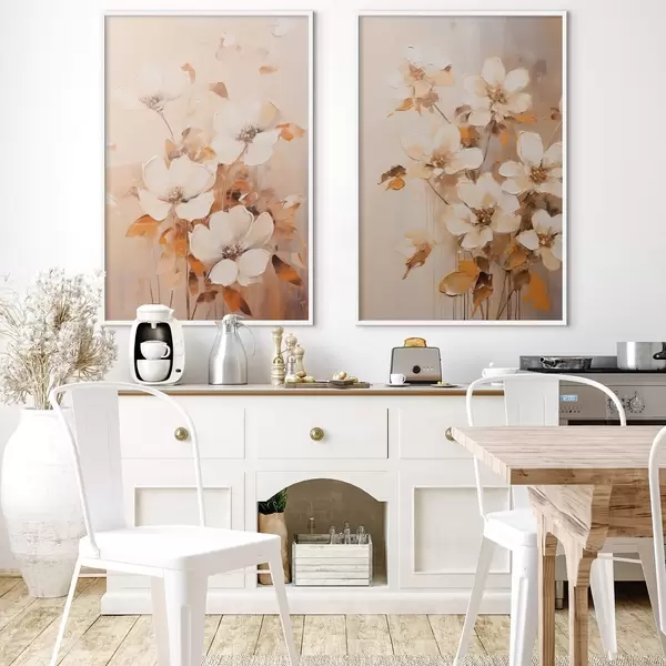 Plakat Valged lilled oranžide lehtedega, õrnad pintslitõmbed, soe värvipalett, elegantne kompositsioon d00656