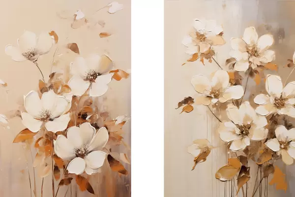 Plakat Valged lilled oranžide lehtedega, õrnad pintslitõmbed, soe värvipalett, elegantne kompositsioon d00656