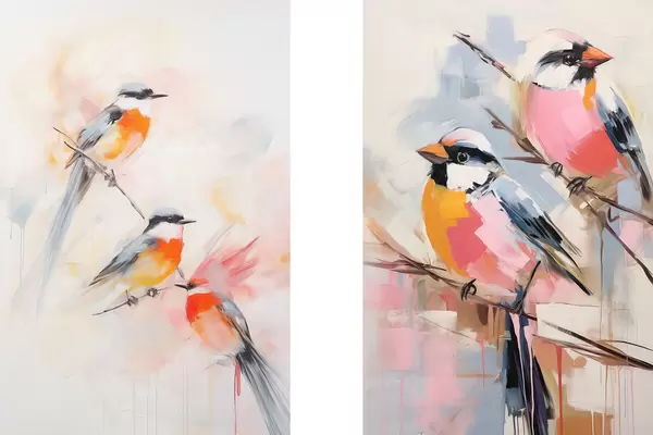 Poster Oksadel istuvad linnud, pehmed pastelsed värvid, heledal taustal roosa ja valge toonid Nr d00658