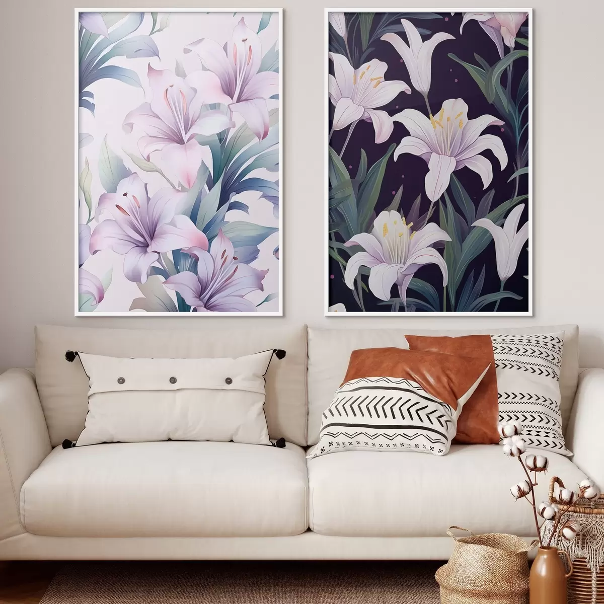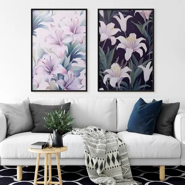 Poster Õrnad roosad liiliad roheliste lehtedega heledal ja tumedal taustal Nr d00689