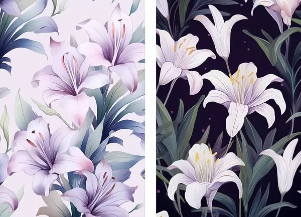 Poster Õrnad roosad liiliad roheliste lehtedega heledal ja tumedal taustal Nr d00689