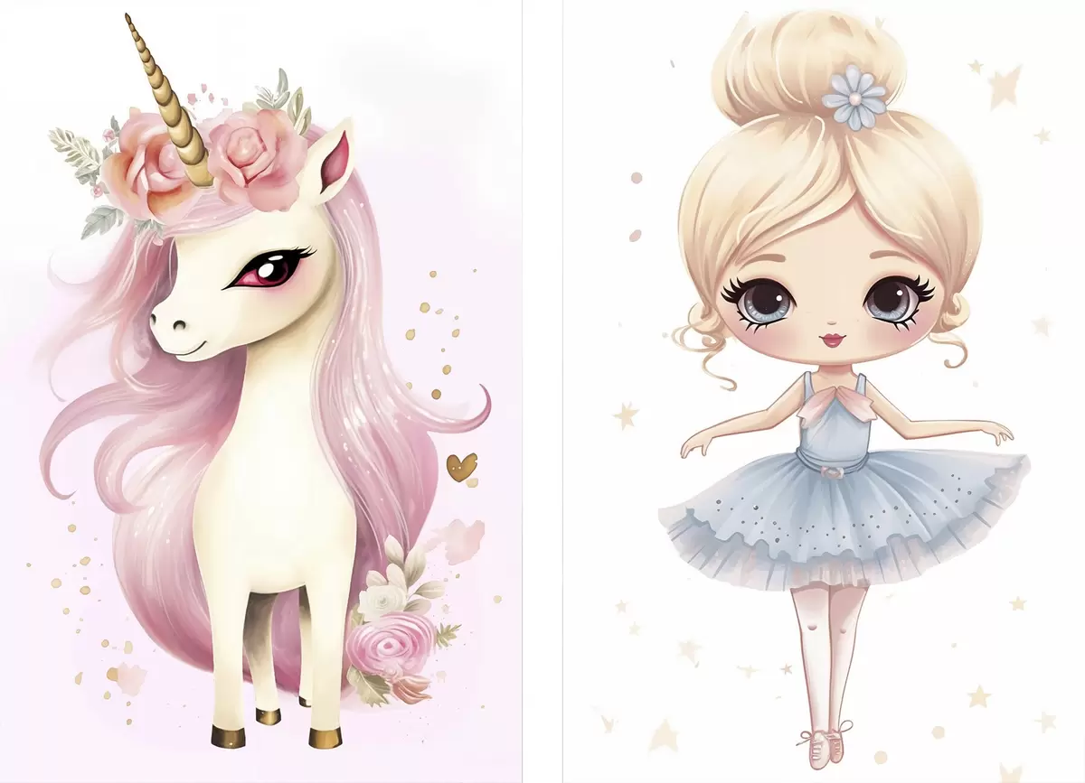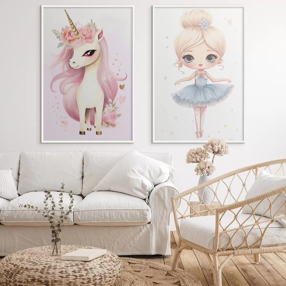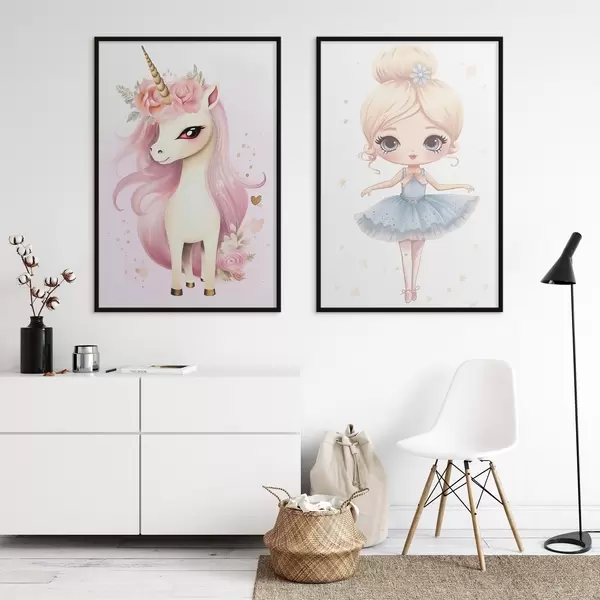 Plakat Sinise kleidiga baleriininukk ja roosa mannaga ükssarvik d00692