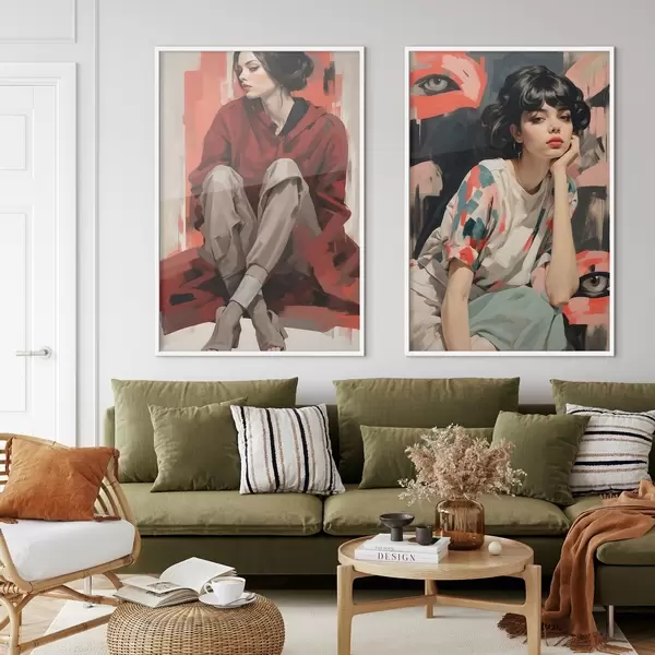 Plakat Tüdrukute portreed punases ja beežis abstraktses stiilis d00695
